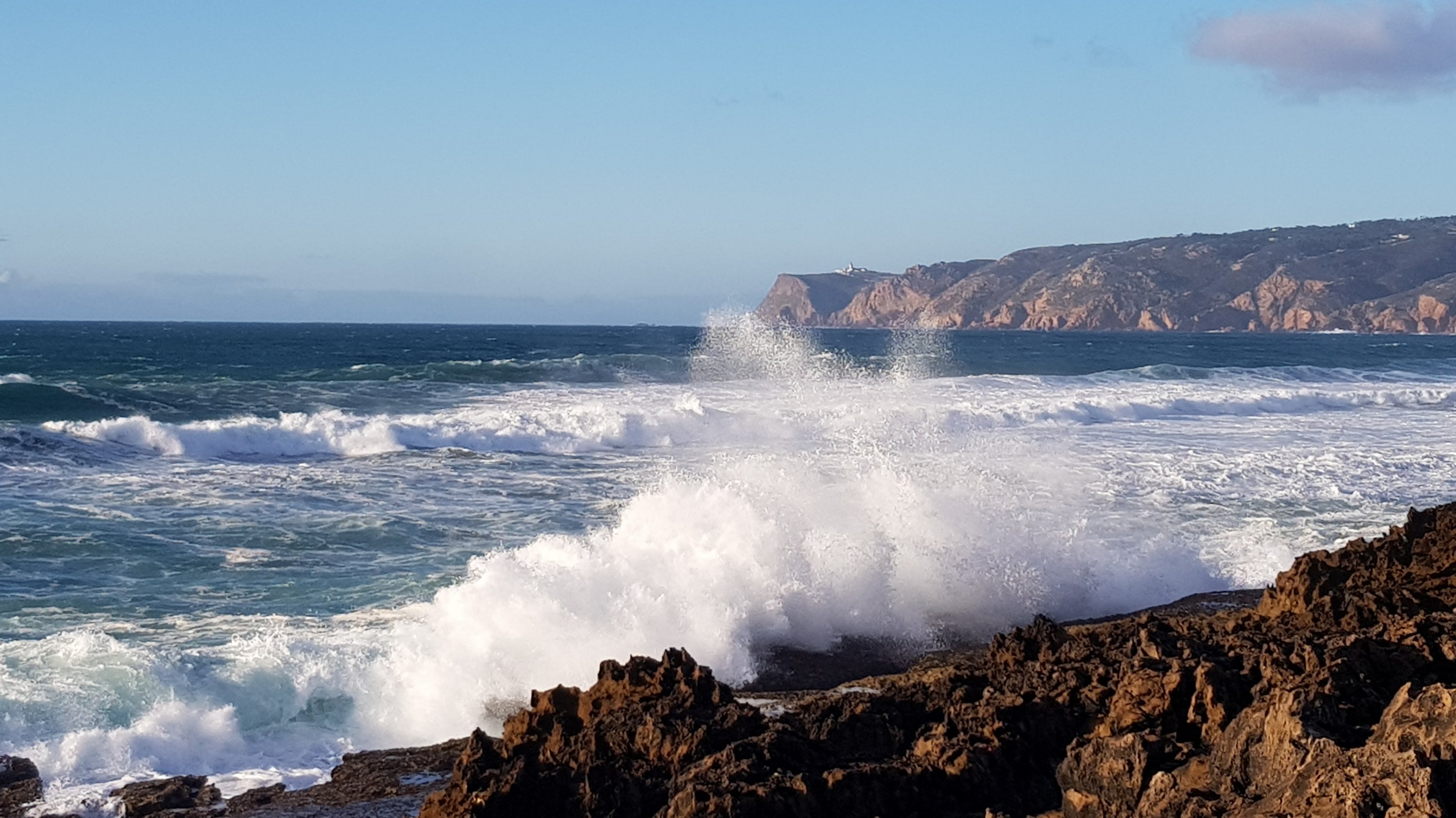 Just ten minutes back up the coast road to our campsite, but we stopped off to admire the huge rollers coming into shore, and the wild coastline heading up to Cabo da Roca, a few miles north and the most westerly point in mainland Europe. Surf’s up!