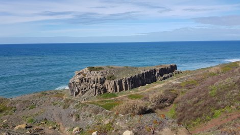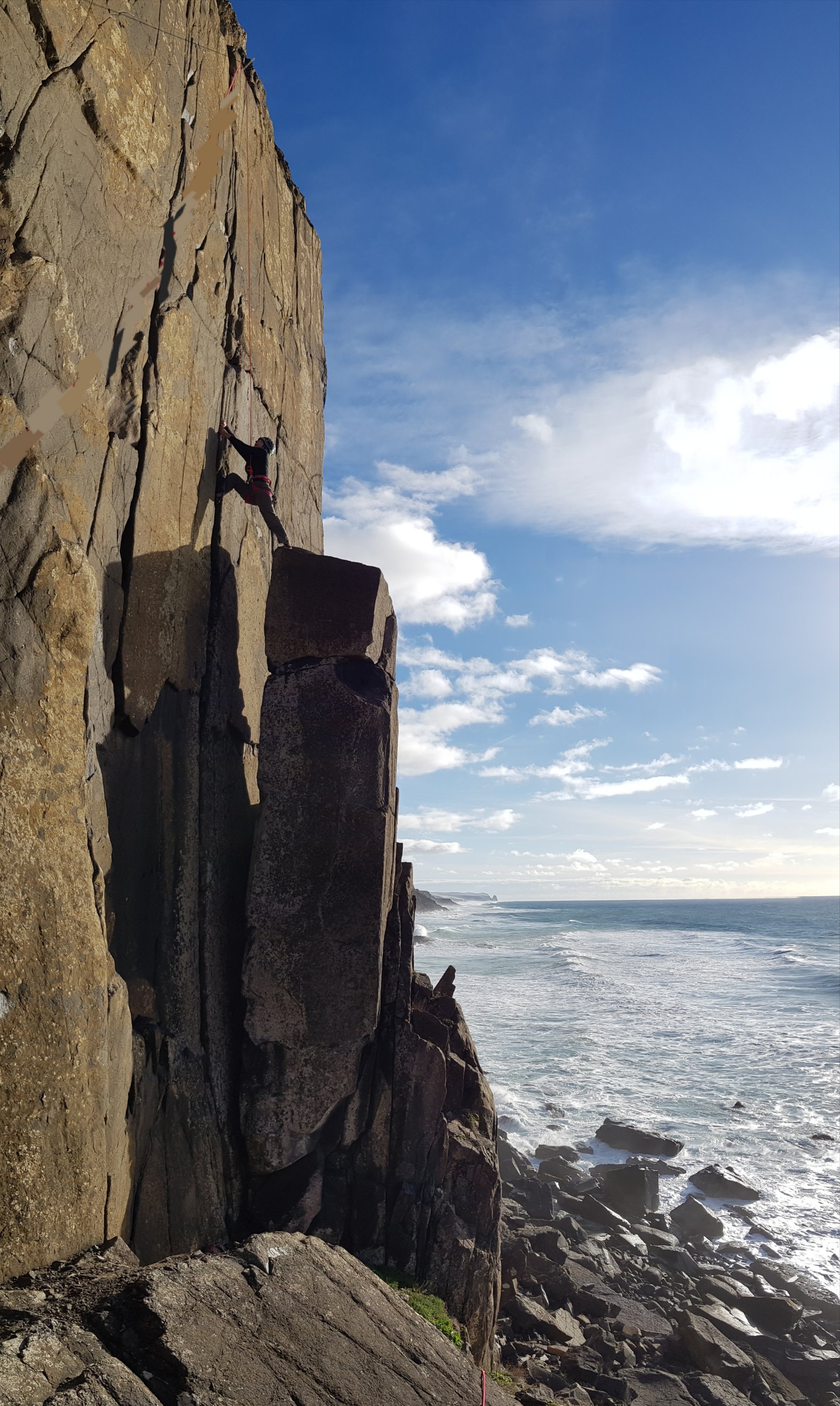 and the seascape and situation are absolutely stupendous, with views all the way south to Cabo da Roca (and the end of the world!) impressive cacophony of crashing waves accompanied by the the occasional waft of sea spray, even 50ft above sea-level. The remaining (now sunny) sectors are natural basalt cliffs rather than quarried remnants and could be mistaken for gritstone at a distance.