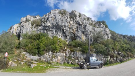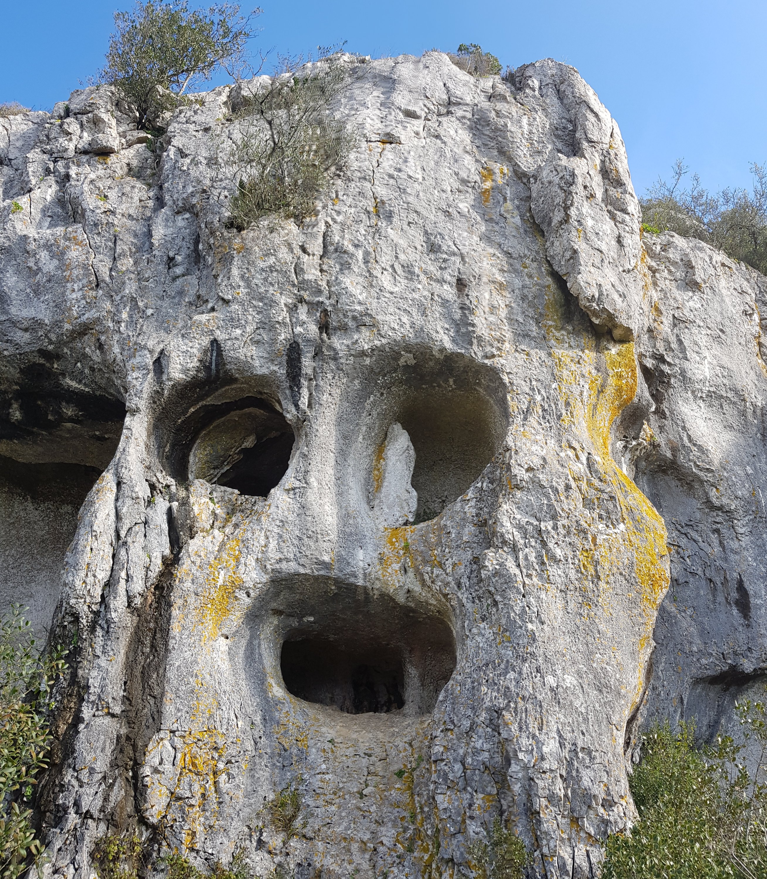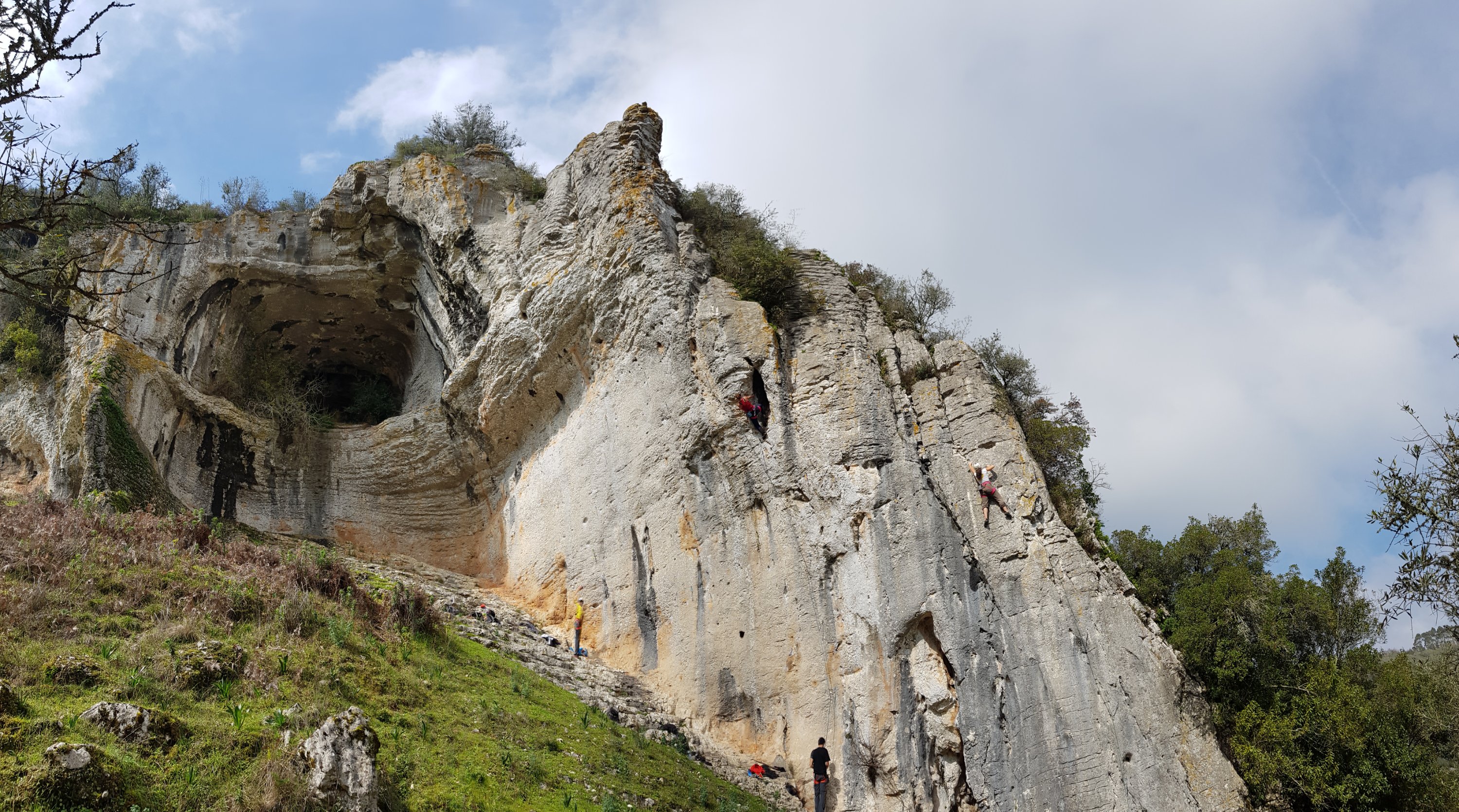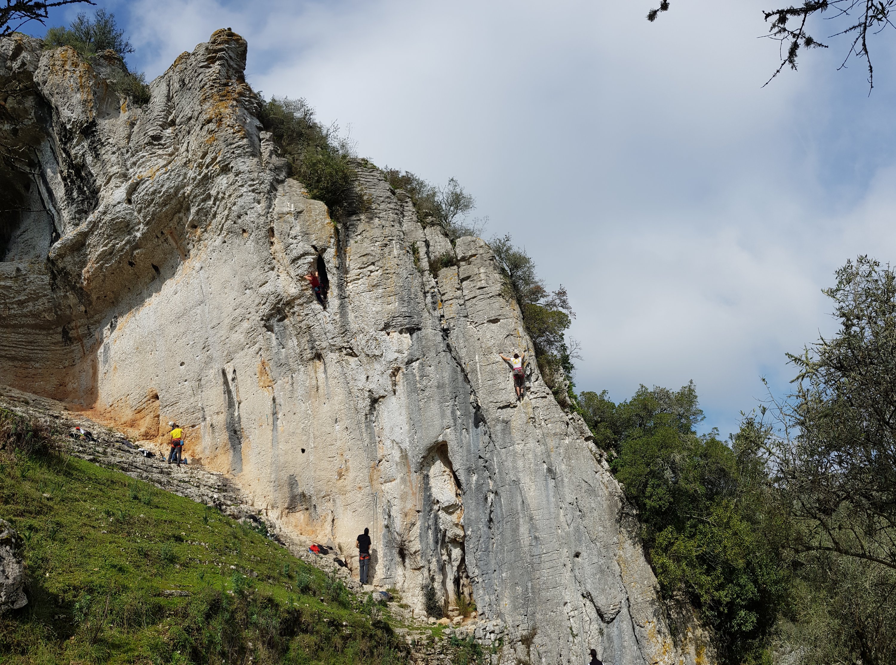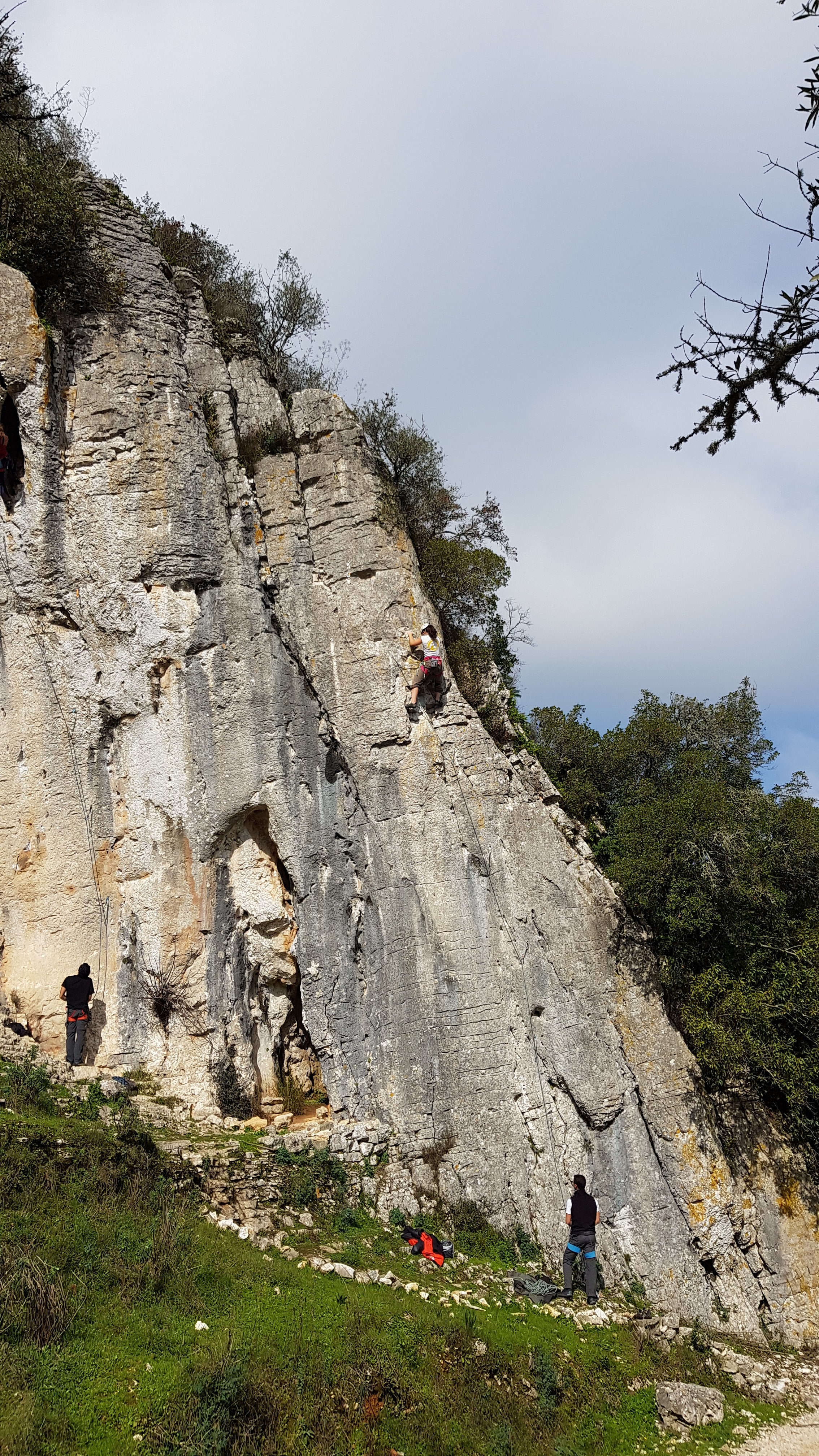 This is an absolutely enchanting spot; a cluster of crags set either side of a dirt road running a mile or so from the delightful village of Casmilo. We occasionally feel a bit intrusive, trundling through a sleepy hamlet and then on through olive groves to park amidst someone’s smallholding, but the dozen or so identical carved wooden signs indicating the route through the village were a clear demonstration that climbers were welcome. Thank you!