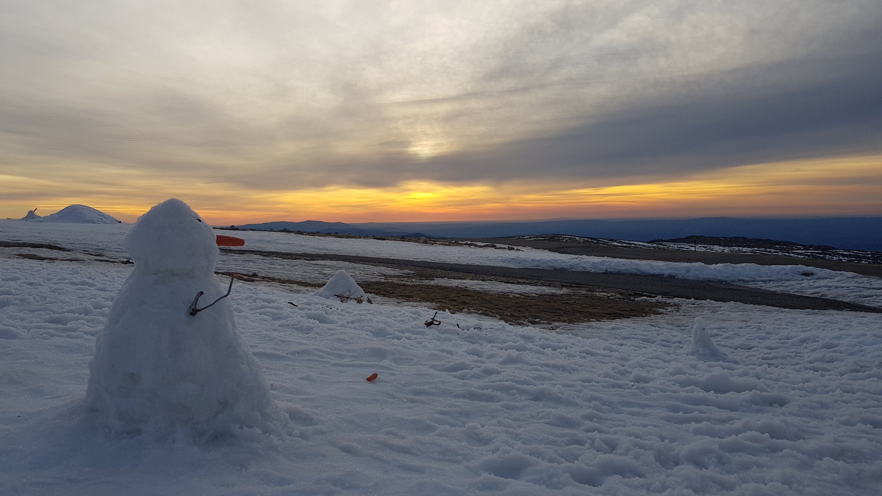 We settled down for the night parked in a magnificent spot a few hundred metres from the summit (along, not down) and enjoyed the sunset and twinkling lights over the surrounding vista, our LPG heater proving its worth as the outside temperature slipped below zero and ferocious winds buffeted the van.