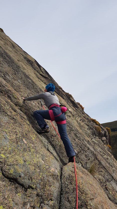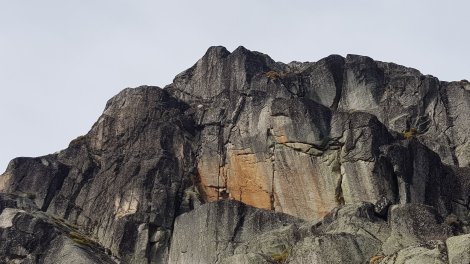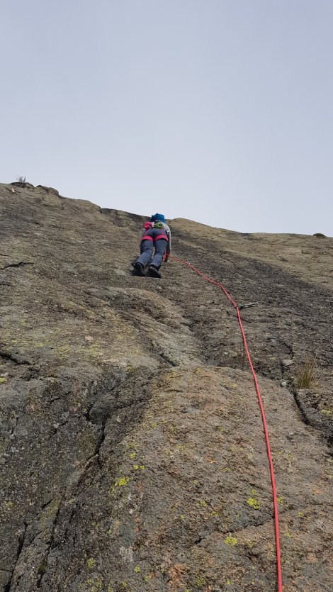 This is a very slabby but immaculately carved 80m chunk of granite (orange with a coating of grey and green spotted lichen), and importantly it faces south. It’s not quite “hands in pockets” climbing (unless you’re Johnny Dawes) but all the lines are about IVish and fairly well bolted, so you can keep moving and stay warm – against all expectations we did 3 routes and 7 pitches in all.
