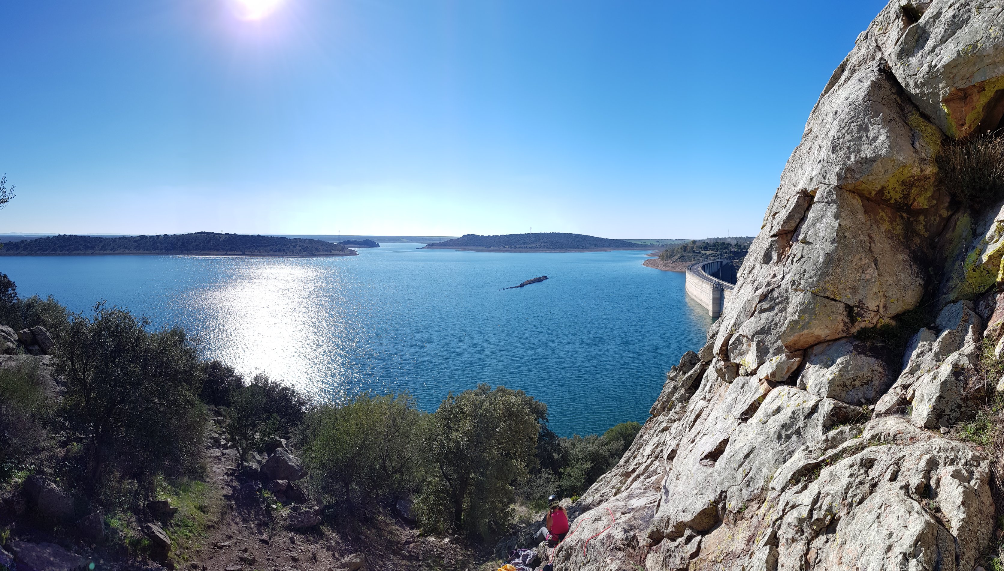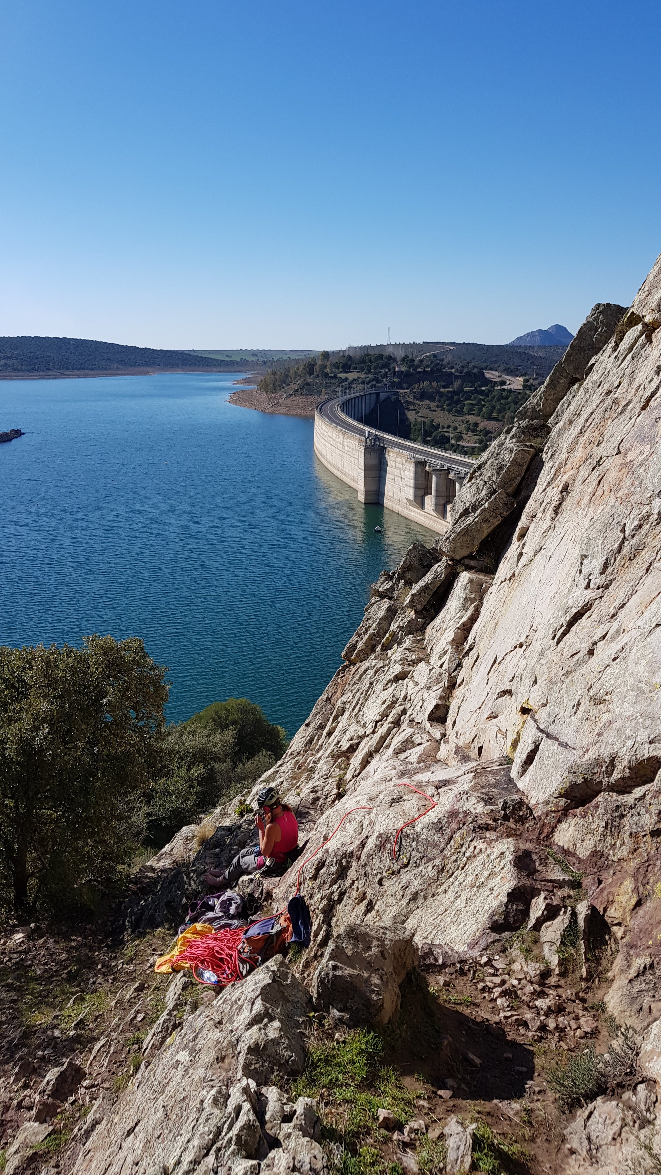 Alange is a quartzite crag situated above a reservoir, just next to the dam. If that sounds a bit industrial you’d be mistaken – the crags are in a protected area (climbing is banned on the north faces through the first six months of the year for nesting raptors) and the setting is idyllic (at least in the sparkling sunshine)