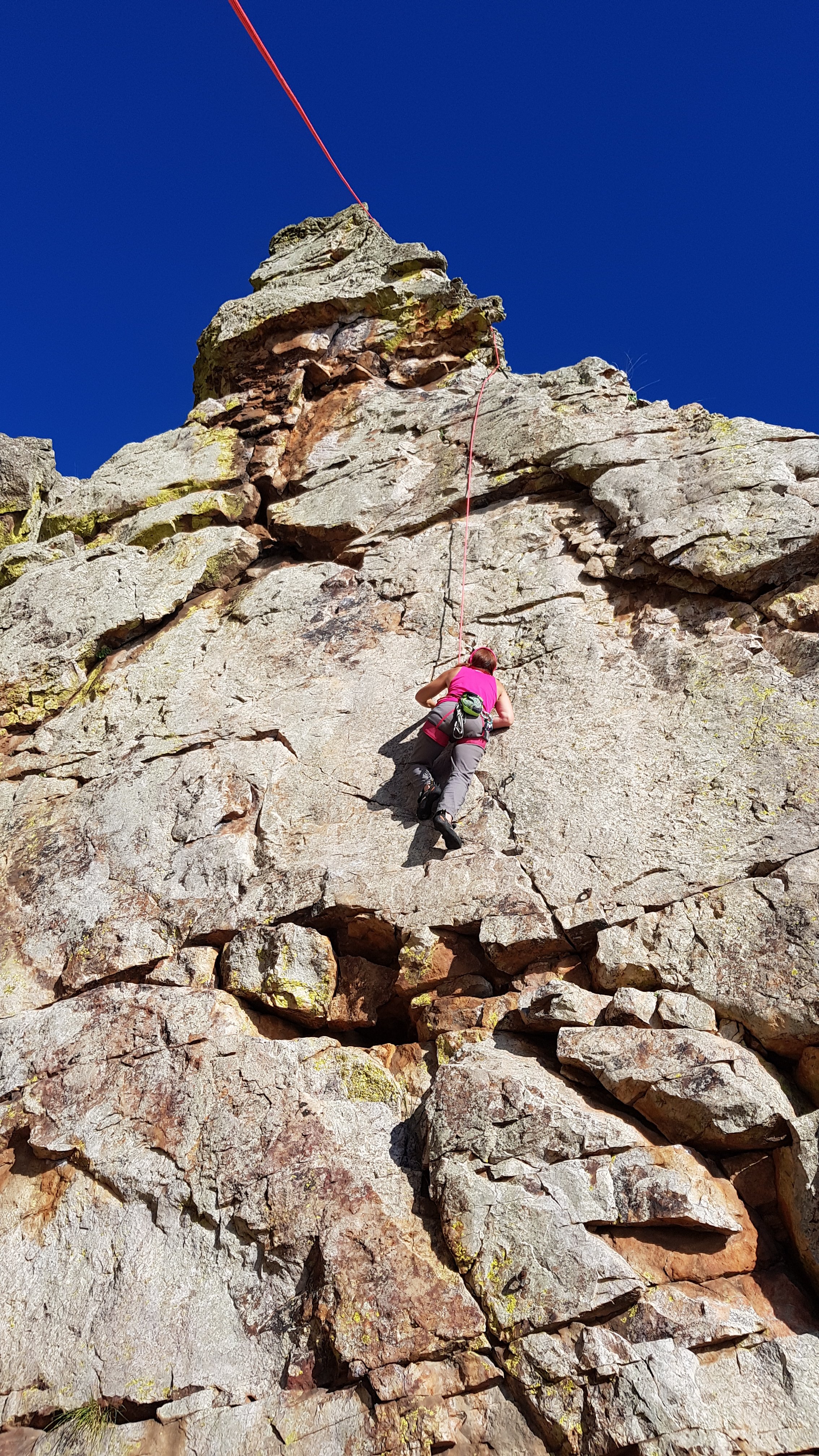 We then did the eponymous route which takes the right hand line on the triangular tower – it’s easy at first until the holds run out… “Gotcha” indeed, where a stiff pull and smear are required. It’s given 6a and feels stiff on the unfamiliar rock. The central route, just right, is Ves menos que un pez frito also 6a and also has a tricky move low down and another over the higher roof.