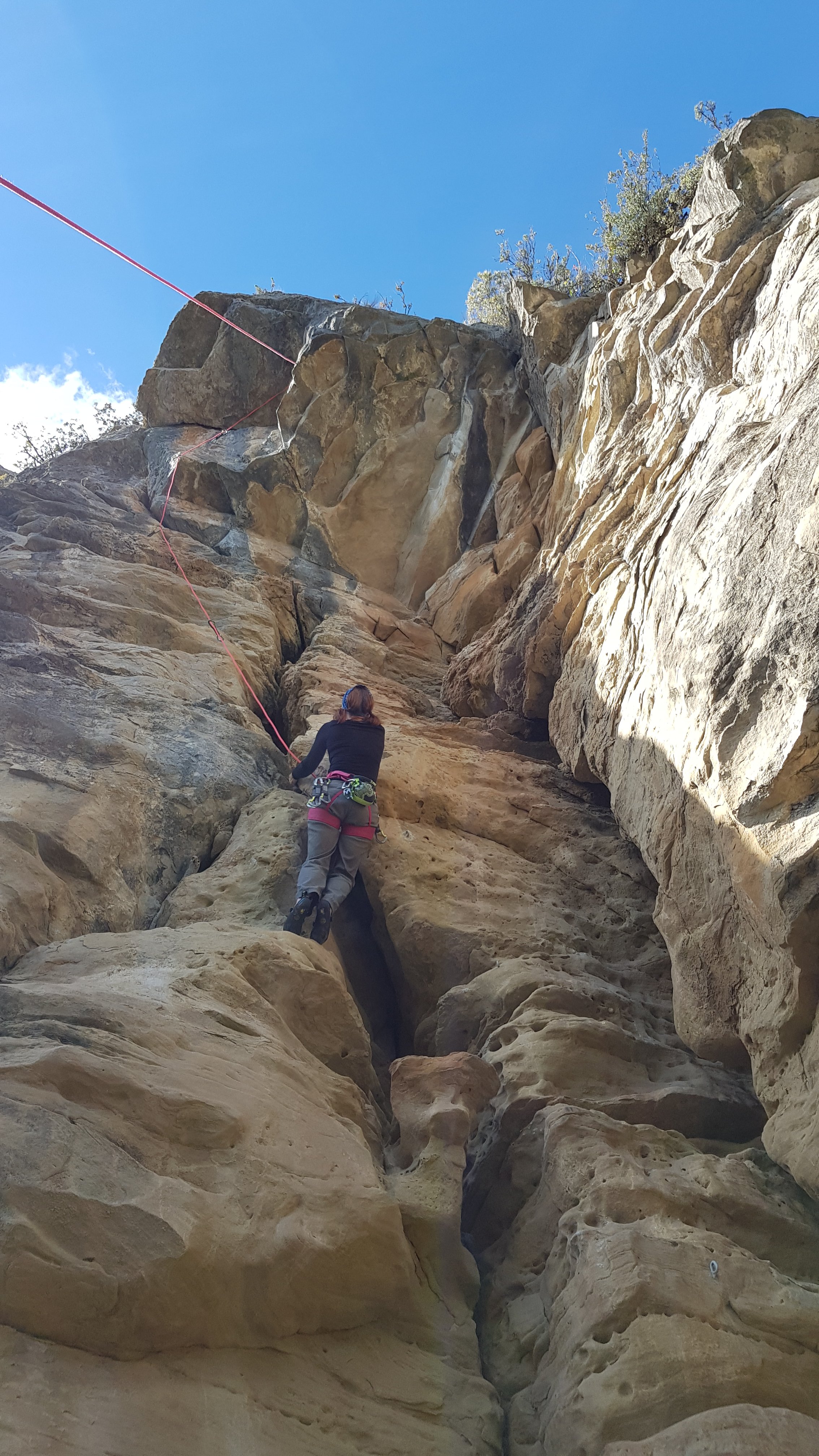 The rock is a fine grained sandstone merging into limestone nearer the top. It’s a bit variable in places (especially on a couple of routes we randomly picked before we really got our bearings) but once we’d found a route list that had a star rating (and most of the routes have a name painted at the bottom)