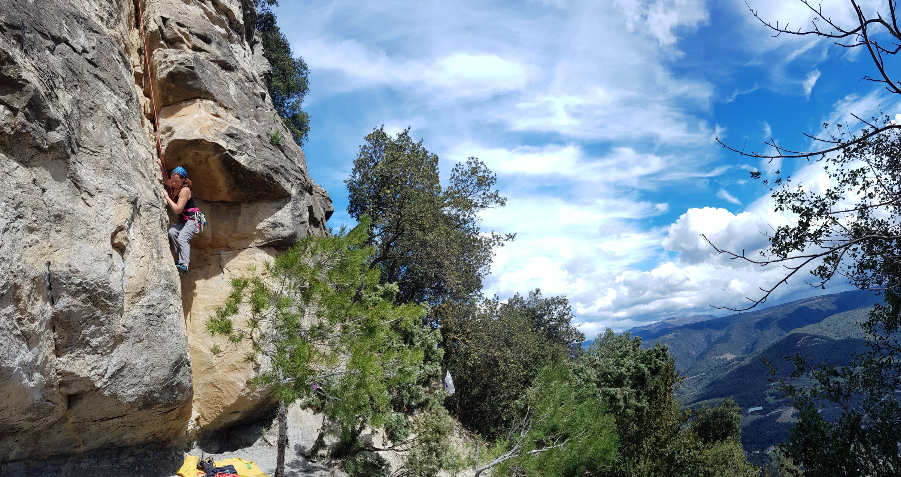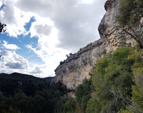 Grau dels Matxos is a relatively recently developed crag about 40 minutes inland from Barcelona, about half way to Vic. Turning off the main drag at Aiguafreda you are confronted with a long band of crags set high on the green tree-covered hillside. The crags stretch for miles, but so far “only” about a kilometre has been developed with about a couple of hundred routes.