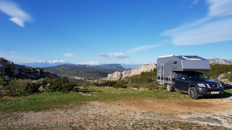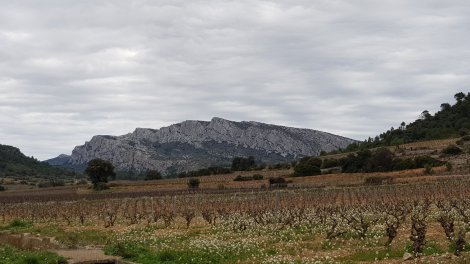 Heading over to Opoul we found a couple of very attractive crags. Les Abeilles is a long crag with about 50 routes from 4c to 7a mostly 5s and 6s, up to 30m high and a 5 minute downhill walk from a handy parking area. This is a great overnight spot which gave fantastic views over the crag and the Pyrenees (now to the south!) in the morning.