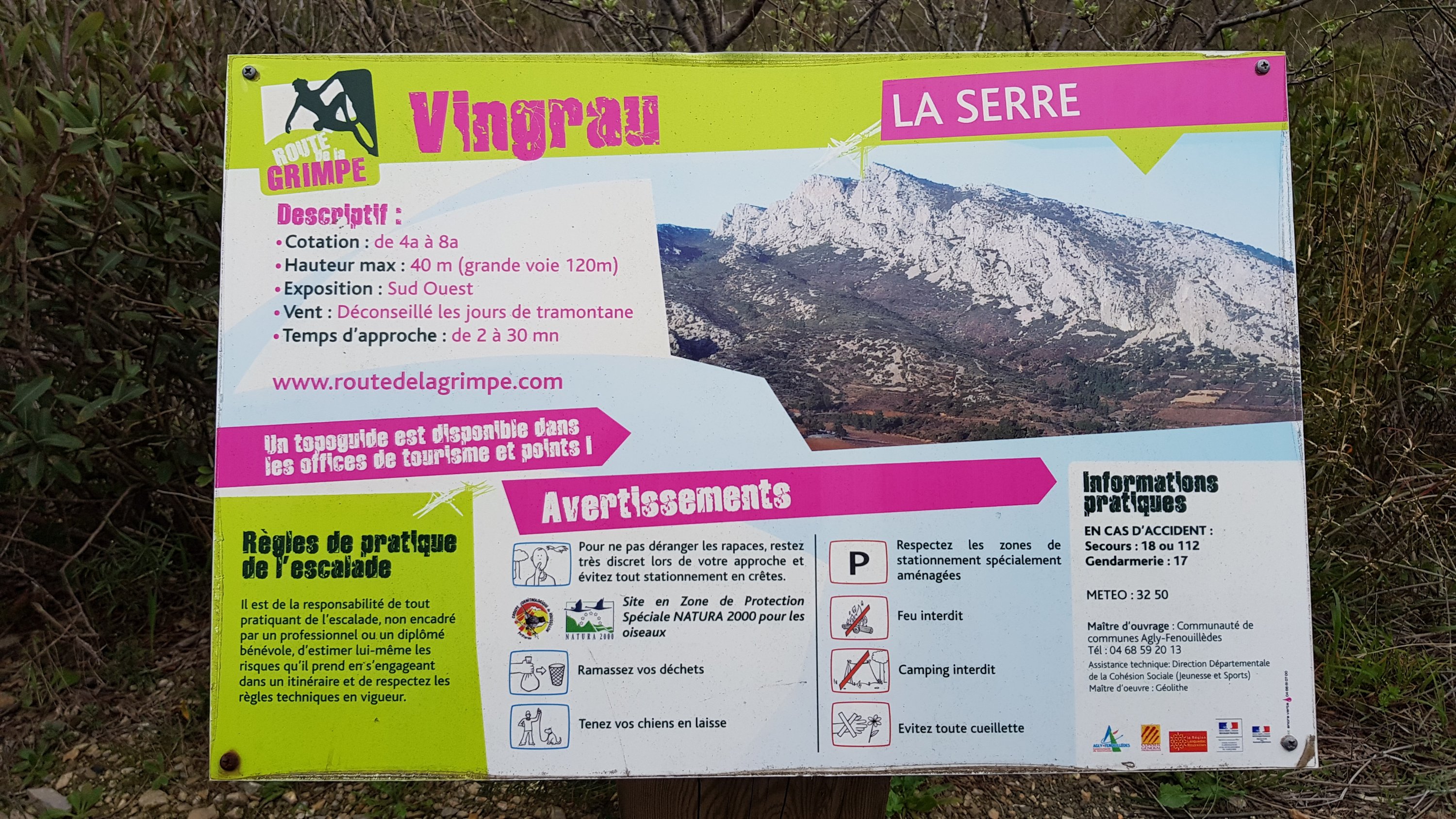 Looking north from Tauteval, the crags of Vingrau are clearly visible as a long limestone ridge running for a couple of kilometres, dominating the far skyline. One end of this abuts the D9 and there’s a dedicated parking area to access the climbing at N42.8520856, E2.7933598 From here it’s a 2 minute walk up to the nearest routes (a preponderance of grey slabs I’m afraid, and we couldn’t find a guidebook though there’s a suggestion that you could pick up a topo at the tourismo in the village). Reassuringly, there are signs promoting the climbing at a number of the car parks, rather than detailing bans!