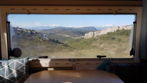 Heading over to Opoul we found a couple of very attractive crags. Les Abeilles is a long crag with about 50 routes from 4c to 7a mostly 5s and 6s, up to 30m high and a 5 minute downhill walk from a handy parking area. This is a great overnight spot which gave fantastic views over the crag and the Pyrenees (now to the south!) in the morning.