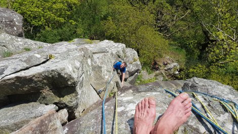 By now it was getting pretty warm and we were somewhat jaded – feet swollen and objecting to being squeezed into tight rock shoes. Shame not to make the most of the gorgeous weather so we settled for a warm down on Creagh Ddu Wall Direct, VS. Here’s Paul following the first pitch (along with a picture of my grumpy feet!)