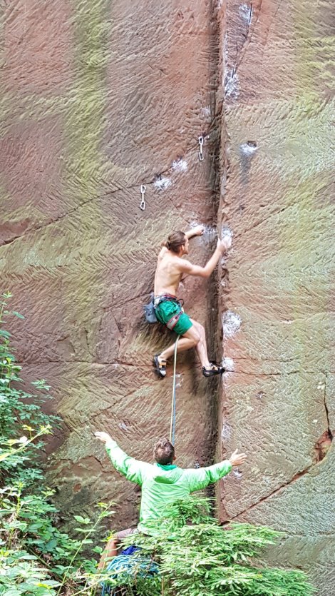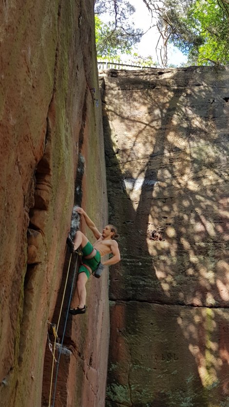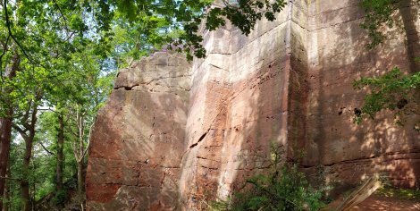 Hidden in the trees, it’s a long disused quarry of very soft sandstone that’s historically been mostly used as a top roping venue and more recently has become a hot bed for goey top-end E-grades. The quarrymen have hand sculpted spectacular stepped walls, corners and aretes, with very few cracklines. Nature has helped out by providing numerous pockets, from monos to huecos, and climbers have placed the odd peg to supplement the sparse natural gear.