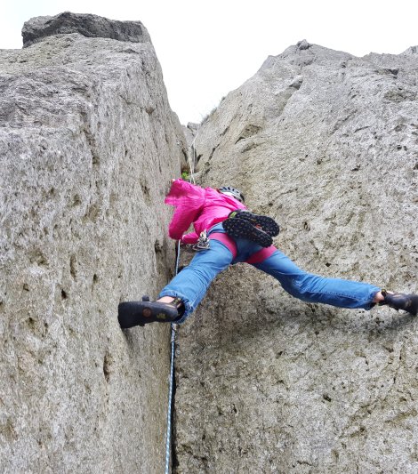 Just to the right, the combo of Great Feet and Mean Feat gives an excellent E1. Committing crimps on good quartzy holds and only just enough gear enable progress through surprisingly steep territory to reach a small niche at the foot of a steep corner. More traditional bridging and jamming takes over here, with more fun pocket holds to supplement. Great route! Here’s Helen in the corner