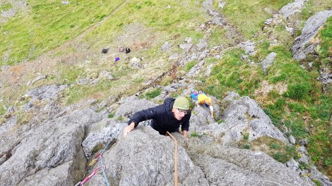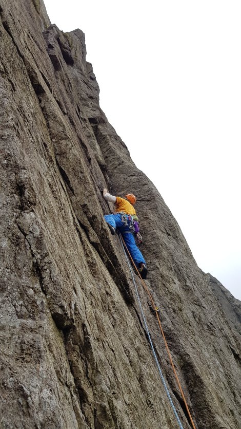 Stan set off up the second pitch – a smooth and awkward right hand groove which gradually peters out forcing a tricky step left into a steeper and more awkward second groove. Plenty of tricky moves justifying a 6a in some guides, but with generally good gear. Good lead!
