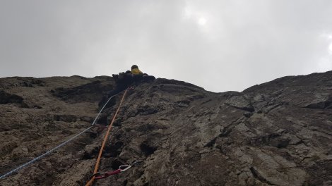 I’d been itching to get on Cloggy ever since the dry spell started, but had been distracted by the lure of Northern Scotland and various other commitments. Andy and Stan were easily persuaded, despite the iffy forecast, and we spent much of the two hour car journey trying to identify a quality route that none of us had done. We settled on Daurigol, a fine 3 pitch E3 up a series of grooves that bound the left hand side of Great Wall. I was nursing a dodgy back so baggsied the first, easier, pitch – a slightly dirty groove to a break followed by a tough swing rightwards onto a small quartzy ledge and another thin groove to an airy belay. Slightly damp in the clag and a timely reminder that these were good conditions for Cloggy (ie a north facing mountain crag at close to 3,000ft). Here’s Andy and Stan following the pitch.