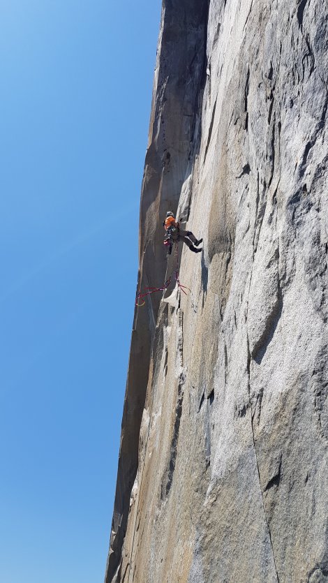 Straight out of bed and into a 5.8 squeeze chimney – great way to start the day. Happily, pitch 11 of NAW is nothing like the horror show of The Hollow Flake on Salathe – fairly secure back and footing once you actually wrestle your way into the chimney (hint – take minimal gear) and even some holds! This brings us to Big Sur – the major interchange on this side of the big stone (we could have done another couple of pitches on SOD to arrive at the same spot if we’d thought about it…. But that would have included the infamous “Hook or Book” – lucky escape!)