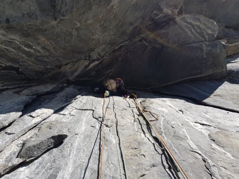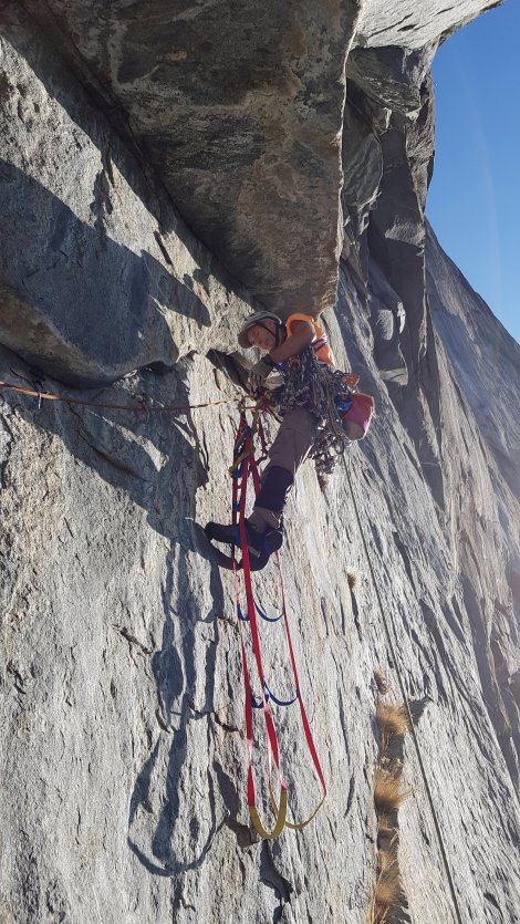 We had a comfortable night on the ledge in The Black Dihedral, though the slight phosphorescence in the quartz intrusions conjured all sorts of interesting faces and features in the flickering torchlight. By morning it was just rock again, but the holds on El Nino were looking well chalked and tick-marked. Impressive territory to be free climbing!