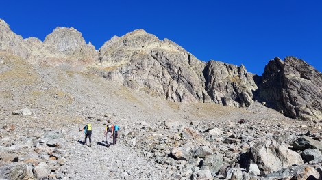 Pitch 2 gets 6a+, but this might be a typo – it’s just one move off the belay followed by a romp up to the first band of ledges and a join with the main route. Shorts and shirtless at 2,500m in October – can’t be bad.