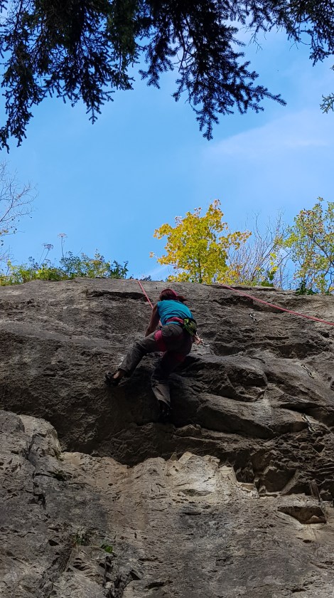 There are a couple of excellent 2-pitch routes that can each be done in a oner with a 80m rope: L’Eclipse, 5c and Les Cyclamens, 6a+ – a bit like the easier routes at High Tor might have been before the polish, which is praise indeed!