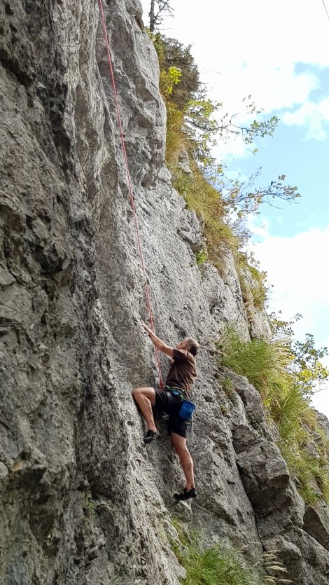 Heading further left on a higher level path, La Vie Devant Soi , 6b is very good, with a thin and tenuous first 10m up a tricky ramp followed by 15m of fun climbing up a steep slab. Sticking to the lower path you arrive at sector Coucou Cherie, which is the main event here (and had we known, we’d have skipped straight here). We had a go at the route that gives its name to the sector, a 40m 4* (out of 3!) 7a, but got stopped by a super thin crux rockover with a microscopic crimp.