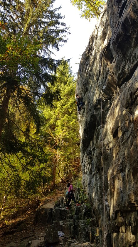 It’s not a huge crag – about 15m high and just a couple of dozen routes, but with a good spread of grades from 5s to 7a, great rock blessed with square cut, crimpy holds, and a really easy access (downhill about 2 minutes). It faces pretty much due south but is heavily shaded by trees, making for comfortable climbing temperatures (belaying in jackets in October).
