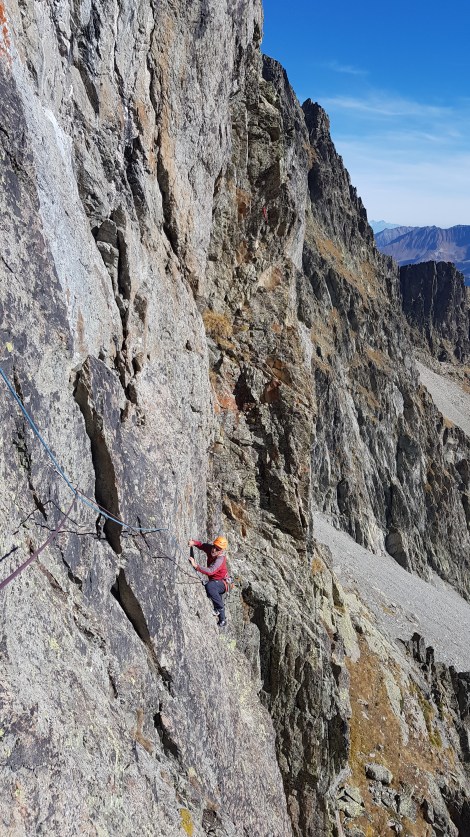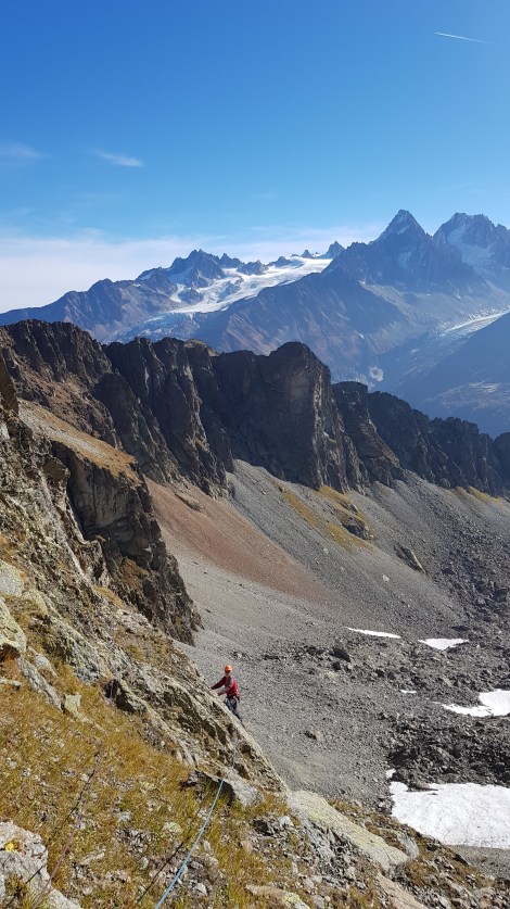 Ignoring the attractions of another route on the Grande Floria, we traversed further right beneath the Aiguilles to open up a further vista of possibility: Point Gaspard and Les Crochues.