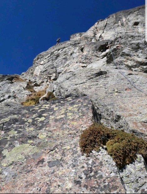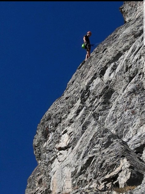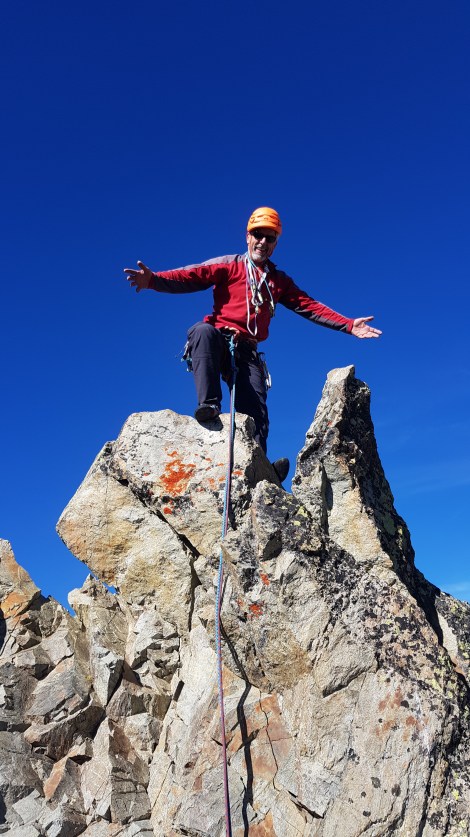 From the top of the climbing there’s the option of a short scramble up typically fractured terrain to bag the actual summit (2,741m – who said I’m a crag-rat not a mountaineer!?) and the obligatory photo – just under two hours of climbing.