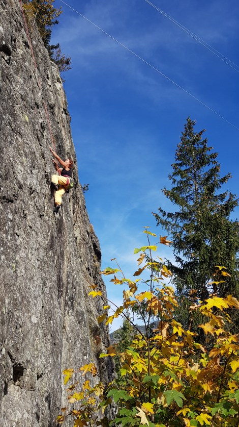 The somewhat utilitarian name belies an excellent little crag. Gietroz is the easterly extension of Barberine and has a bunch of sectors scattered over the hillside. Pylon is just over the border into Switzerland – immediately after the border post (less than 50m) take a left turn for Gietroz that weaves up the hill and over the train track, take the right fork immediately after the bridge and park in a gravel covered area next to some brightly coloured bee hives and a blocked off tunnel. N46.051890, E6.947436. It’s a steep and winding 10 minutes approach from here, up a faint path right of the tunnel via an awkward hop onto a large boulder then a vague leafy trail up and left through huge boulders and between an apartment-block-sized boulder and the crag…