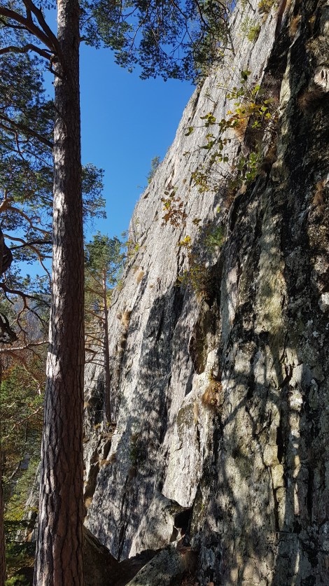 About a dozen 20m routes on steep, featured white granite, from 6a to 7a. We did LouLou Lillett, 6a