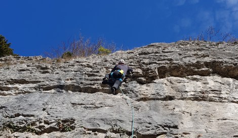 Garage Buttress fits the bill perfectly, with the upper tier routes (left of Colonel Bogey) being above the tree line so benefitting from all the solar power available. Jim was easily persuaded and we pretty much ticked the crag with a bunch of 6b+s/cs, an E4, Matricide (that is really just a slightly runout 6c) and a decent stab at I Hate You, 7a. Here’s Jim pulling through the bulge on Unloaded, 6c