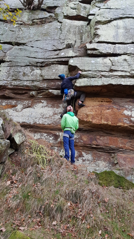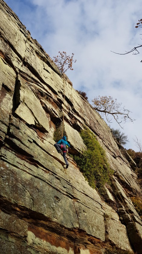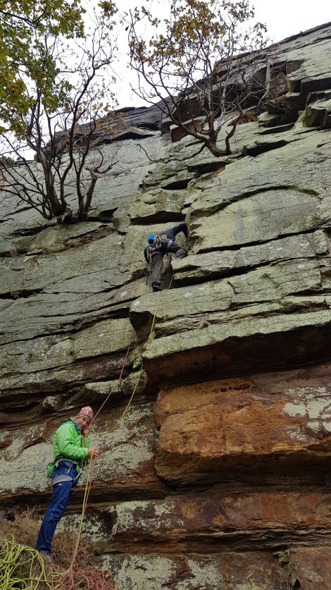 Glorious autumn colours and occasional glimpses of sun over the Woodhead gave way to grey dankness as we neared the crag. Damp, lichenous rock did nothing to reverse the feeling that we’d perhaps made a duff choice, and this was seemingly confirmed by our “warm up” SOS. Jim made a great job of it in the conditions (how the move off the ground gets 4b is a mystery)