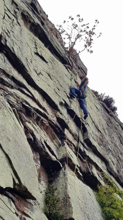 Talk turned to which pub we should go to, but a slight lightening of the sky and the promise of “good protection” encouraged me to try Conjunctus Viribus – great route, with some stiffish but well protected moves via twin cracks in the headwall; soft for E1 and actually felt easier than Jim’s VS.