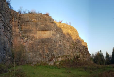 Another day promising blue skies after the mist has lifted prompted another trip along the M55 to Clwyd limestone. Andy and I made an early start to make the best of the short day, which had us nearing Oswestry as the drizzle started, resulting in a detour to the Lazy Kettle transport cafe for tea, bacon butty and procrastination. There’s only so much tea you can drink, so it was still a bit murky as we arrived in Llanymynech – another disused quarry finding a new lease of life as a nature reserve, dog-walking paradise and arguably mid-Wales’ best sport climbing venue.
