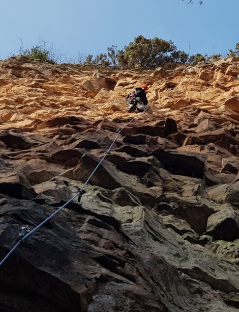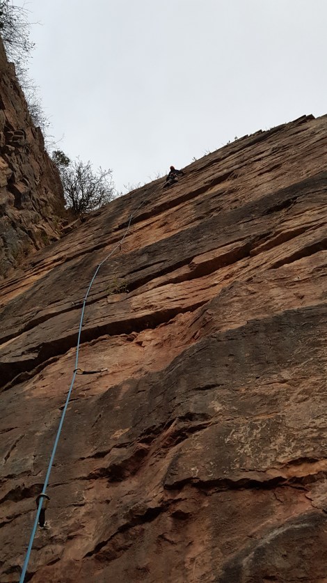 Our warm up on Grid Iron Wall, Up The Spout, a 30m 6b, confirmed the coolth but at least got arms and fingers moving. This is an imposing monolithic flat vertical wall criss-crossed with occasional fault lines, hence the name. (photo taken at the end of the day, after the sun had been and gone…)