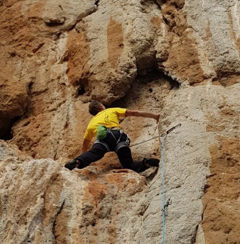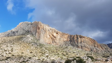 The left hand side of the crag – the imaginatively named “West Zobolo” reaches a height of around 150m and is home to 5 multi-pitch routes. Today’s combination of lighter winds and clearer skies encouraged us to attempt the righthand of these: Kipouros, a 5-pitch 6a+ which skirts the right of the grey wall at the highest point of the crag (there’s nothing up the imposing orange tower beneath the summit – looks awesome!)