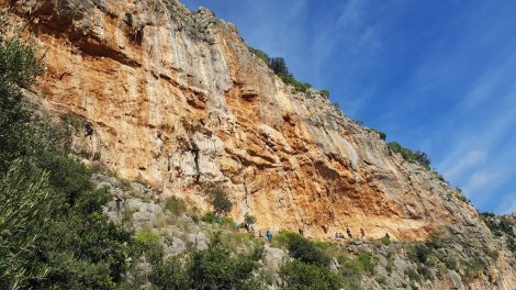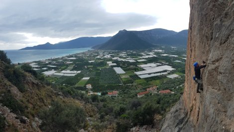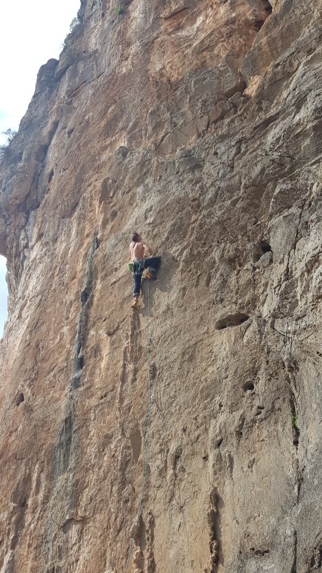 Anyway, today started grey but dry and we headed up to the Theos area in the hope of shelter from the wind and maybe a glimmer of sun. We started on Theos Pillar and our “warm up” Omada, 6a, almost had us packing our bags and giving up for the day – cold rock and colder fingers