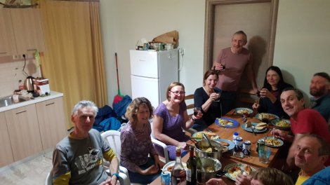 All of which meant we’d worked up a good appetite (not to mention thirst) for the spectacular veggie Greek feast for 15 that Clair had managed to concoct in their 4 person studio – just like the front room at Beudy!