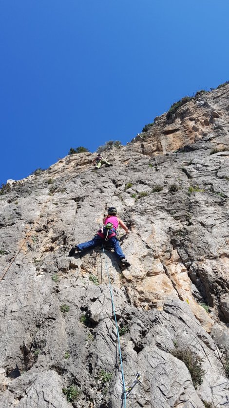 Further right the wall steepens and turns more orange to give the tough but photographic Nanaki, 6b (worth a plus – not helped by the first signs of polish since our arrival in Leonidio)