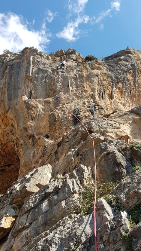 Jake and I warmed up on the surprisingly excellent Psaromalis, 6c/+ on the pillar right of the main cave.