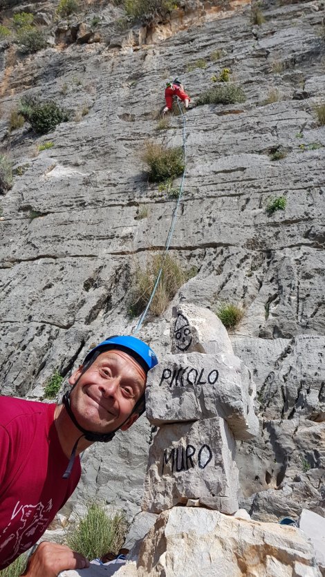 The entry grade is 6c though, so we headed a little further up the hill to Piccolo Muro to warm up. Here’s Helen on Pathfinder, 5c, with Jim demonstrating his most attentive belaying skills.