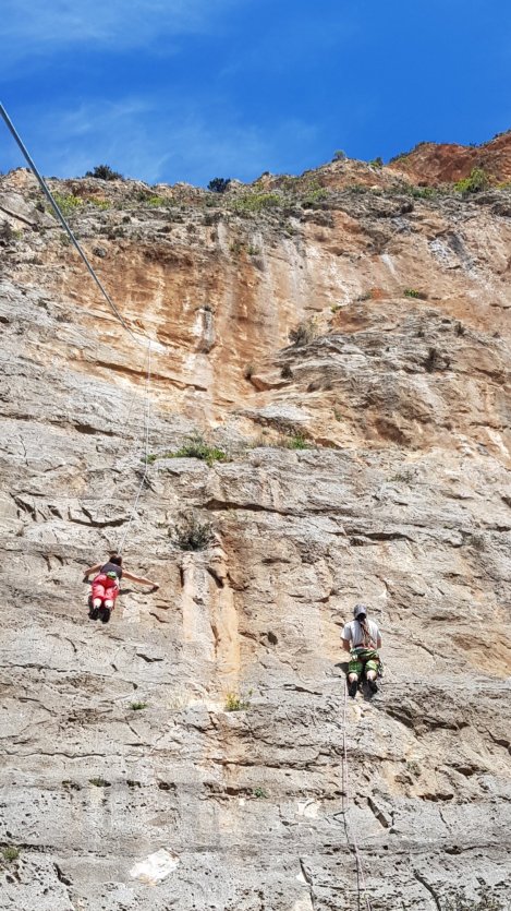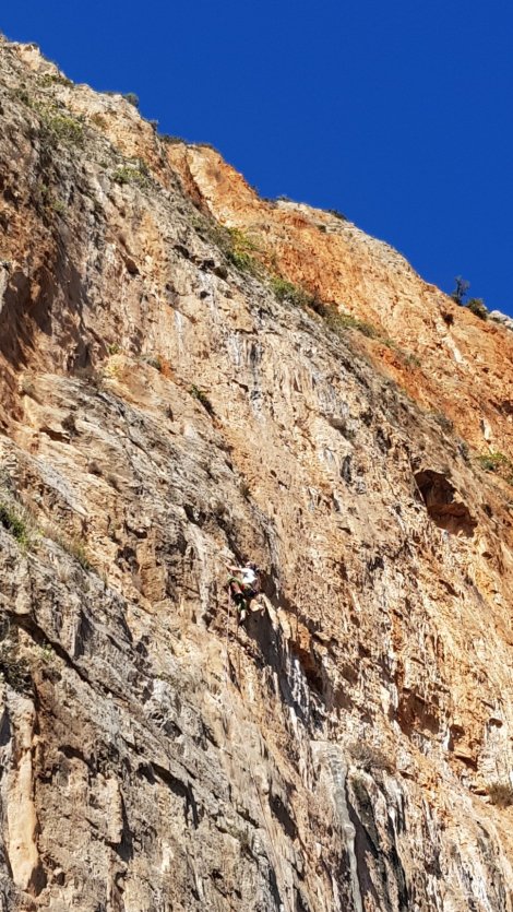 Finally I had a go at Simpatiki, 7a+, but it proved to be a route too far. A very bouldery finishing move involves a long reach from an undercling in a shallow two finger pocket. I managed to reach the next hold but didn’t quite get the sweet spot, so got spat off eyeballing the chain. Here’s a French guy getting it done on his redpoint effort.