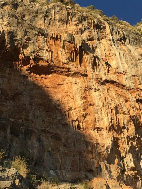This takes an intermittent series of tufa blobs, weaving through wildly overhanging territory to deposit you about 30m up and 5m from the chains at a pair of parallel tufas in the sky. The route is somewhat beyond my usual “pay grade” and I surprised myself by making it to within a couple of clips of the top – by far my best effort at a 7c onsight. Fading arms and a poor choice of sequence meant I plopped off the final tricky moves (note to future self – bump again with your left hand and aim high for the side pull, then haul hard!) Anyway, I was really chuffed with my efforts, and even more so when Chris showed me his photos – he and Keith had happened to be passing at just the right moment to grab some great shots. Thanks!