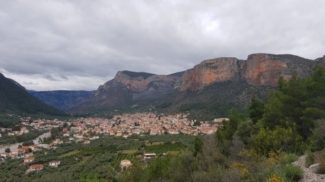 We’d walked past this crag on our way up to King of Thrones on our last trip (moving as quickly as the oppressive heart would allow to reach the sanctuary of shade round the corner!) We didn’t stop for a proper recce but my first impression was of a samey tilted slab covered in goutes d’eau – we weren’t super inspired for a proper visit. However, with rain forecast around 11.30am we made an early start, attracted by the short approach and sunny aspect, to see if we could bag a couple of routes. Perched on the shoulder of the hill between Kokkinovrachos and Panagia, Dornroschen is approached via the path up to the three windmills that dominate the entrance to the valley.