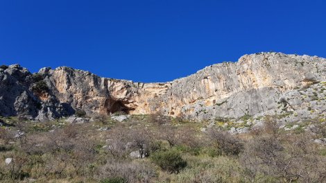 There are about half a dozen sectors here, each with a couple of dozen routes, but room for hundreds more. The impressive escarpment sloping up leftwards in the picture above is Aeolus Wall, which has mostly been developed as a trad crag. Further right there’s a series of walls and caves giving a huge variety of styles and grades. We decided to explore Ourliachto Cave