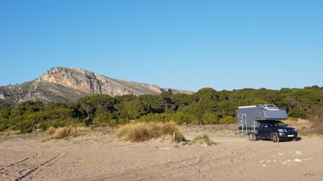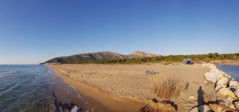 The long strip of sand that forms the seaward boundary of the lagoon is another largely unspoilt ecosystem – home to nesting turtles apparently, and one very discreet campervan.