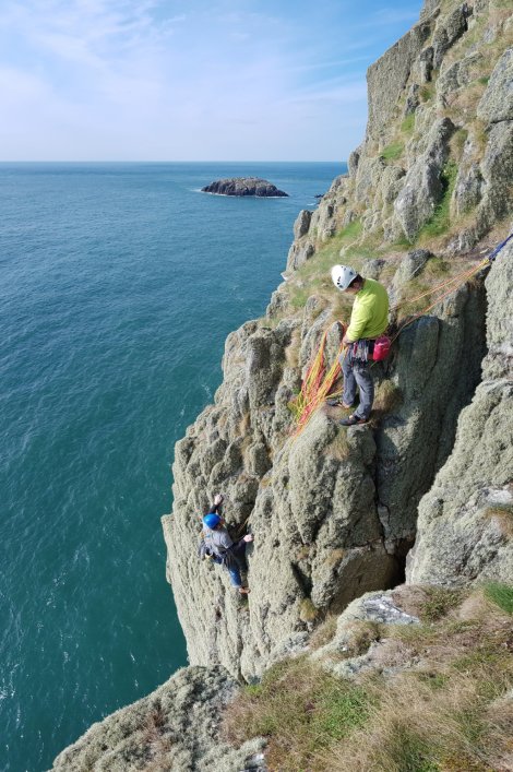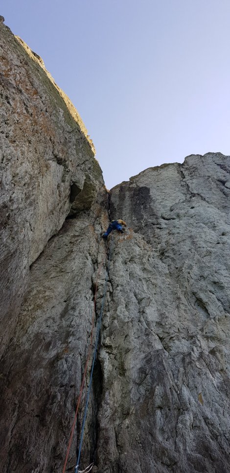 A rather cursory perusal of the guidebook approach suggests the last part after Phaedra is “… a roped traverse” and somewhat foolishly we carried on soloing in trainers. Diminishing holds and barnacled rock prompted a hasty reevaluation, and we roped up (here’s Stan following, with a cheeky seal “photo-bombing” in the background)…
