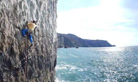 Down again to a hanging belay above the now wave-splashed ledge. By now the sun was on the right wall, so Stan led Mestizo, E1 5b and also very good (and not a whole lot easier than the E2)