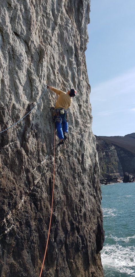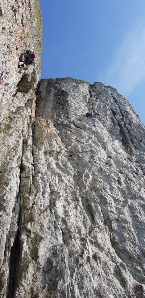 Here’s Stan on the excellent main pitch of the eponymous route – given 5b but probably more straightforward than the traverse pitch.