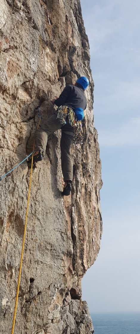 Both routes start at the same ledges, a few metres above the high tide mark – atmospheric spot though as the swell washes in it crashes on the underside of the ledge with a huge boom! you can almost feel, and sends spray blasting horizontally out for 50ft or more.