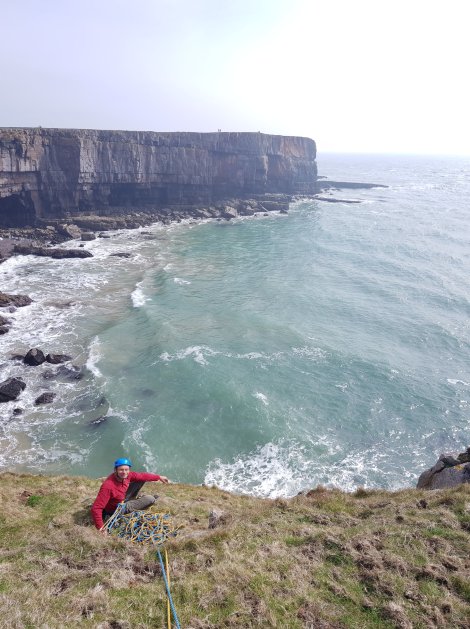 This is the route just left of Chimes of Freedom, which I did last year, and once again we managed to engineer things to be on the hanging belay at bob on high tide (only this time the sea was a bit more spicy). Despite recent familiarity it still took a while to figure out where the route went – basically if you rap from the shiny BMC spec ab stake just north of the Diedre Sud stake you’ll end up just to the left of the start of the route (and you’ll want to clip a piece or two of gear on the way down as otherwise you’ll be in the briny!)