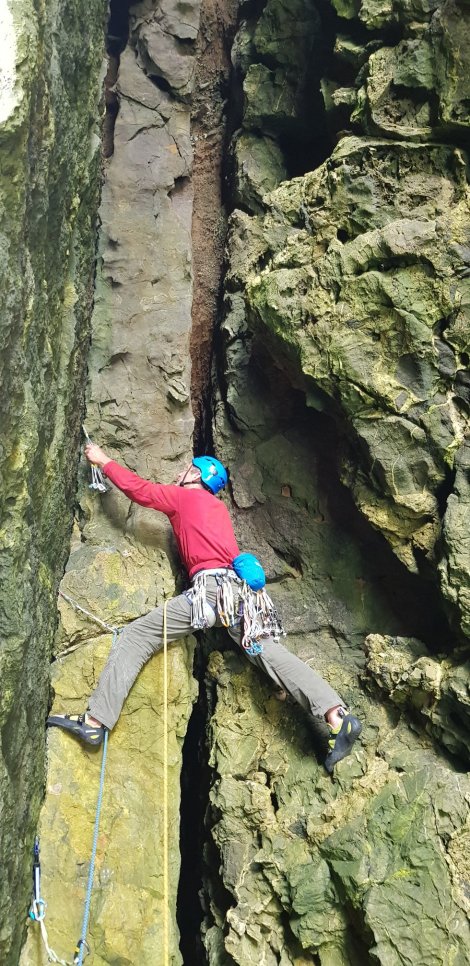 and it’s Jim’s turn to lead – Joyous Gard; an excellent HVS (top end) that is perhaps unjustly overshadowed by its neighbours. Good steep fun with a memorable section through a fully enclosed cave / runnel.