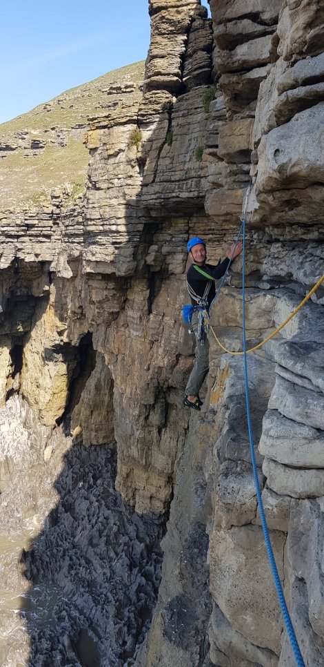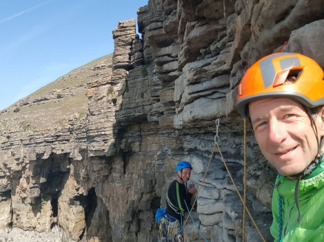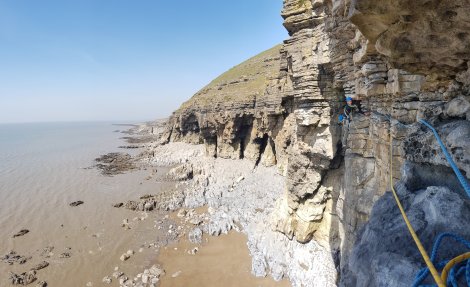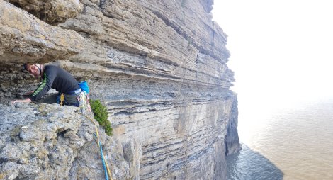 It’s only a couple of hours after high tide when we arrive, and there’s absolutely no evidence of the “beach” at the bottom of the crag, so we’ve a choice between an hour topping up our tans or heading down for the classic high-level traverse of the crag. Gluttons for punishment, we rack up – Bring on the Exposure Explosion!